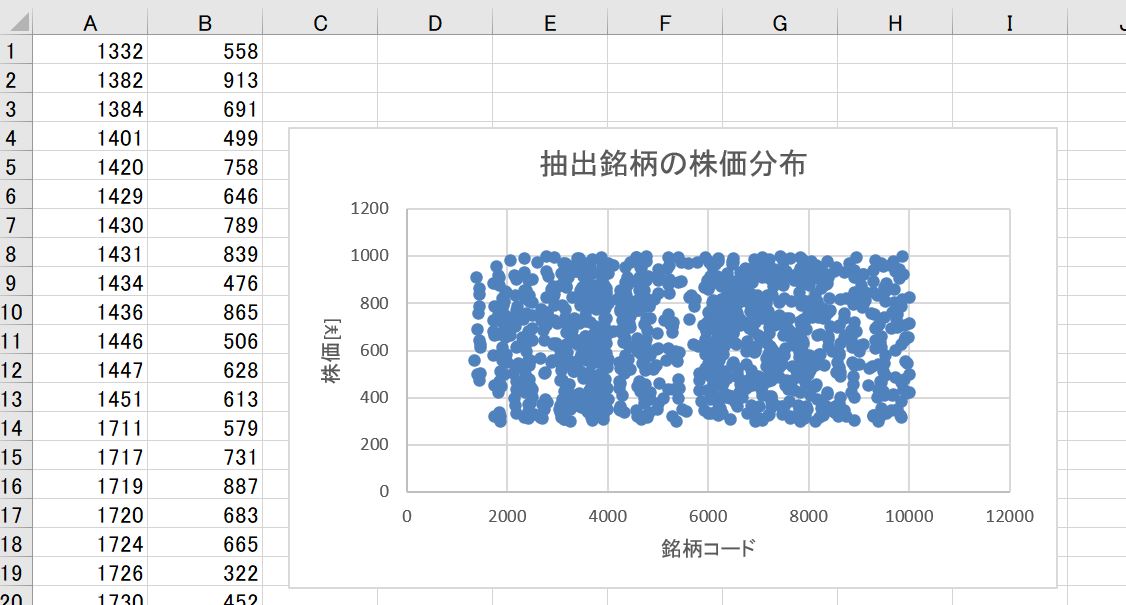 今回は①全銘柄の株価を一覧化し、②自己資金に合った株価の銘柄に絞りこむことに成功しました。